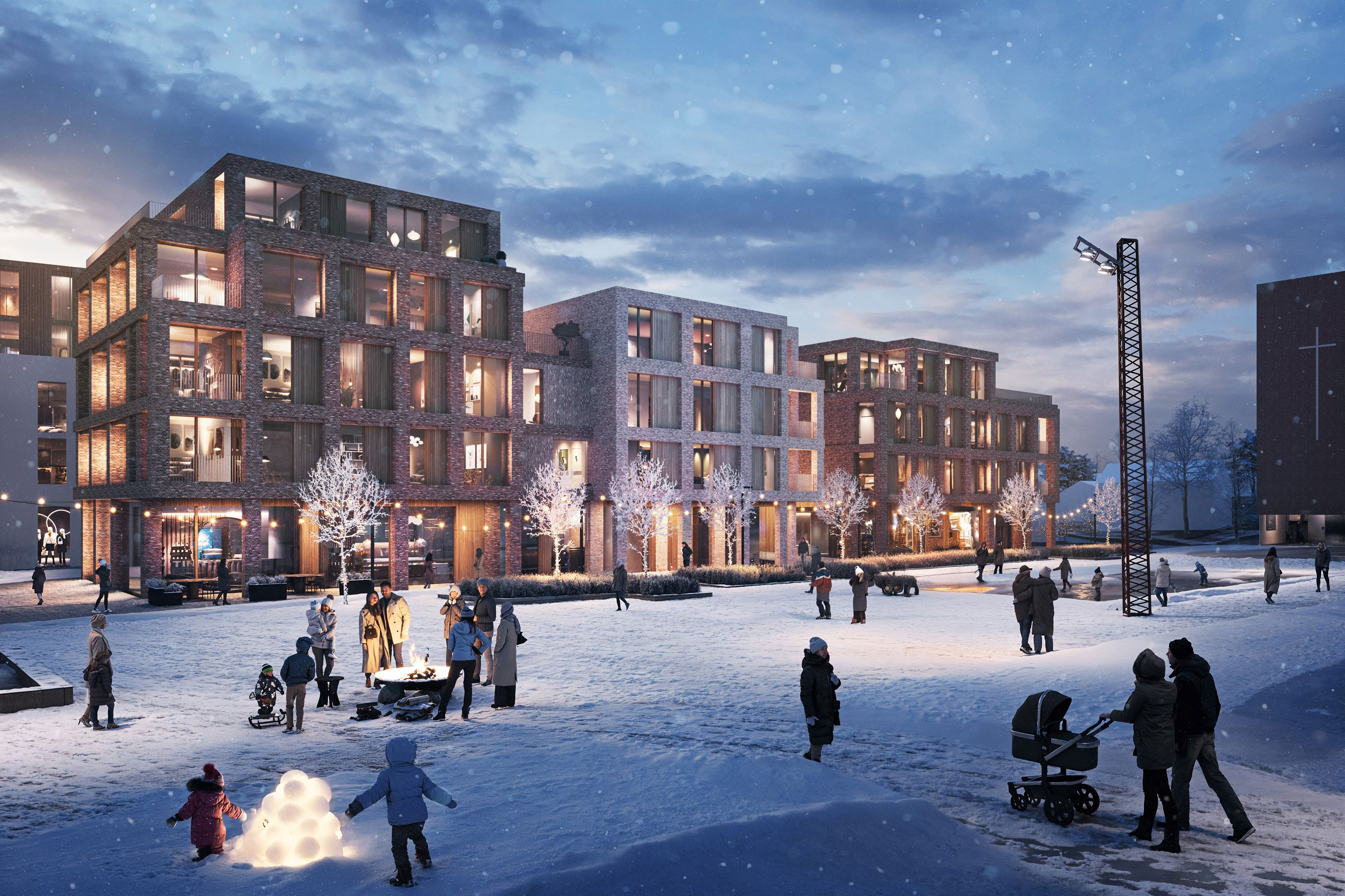 På toppen av noen av byggene finner du felles takterrasser, og mellom byggene ligger innbydende uteplasser som utgjør naturlige samlingspunkt for beboerne… Det blir praktiske fellesfasiliteter som ski- og sykkelverksted og sosialt fellesrom.